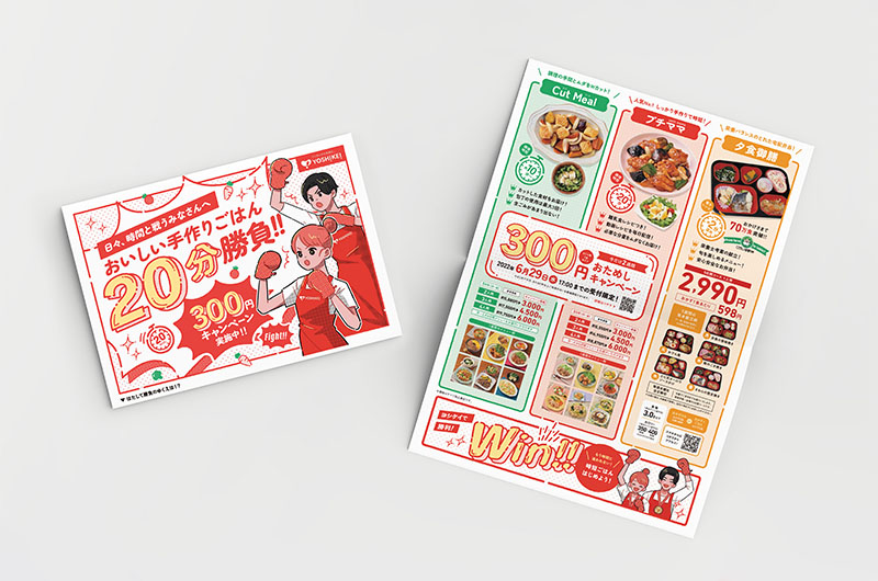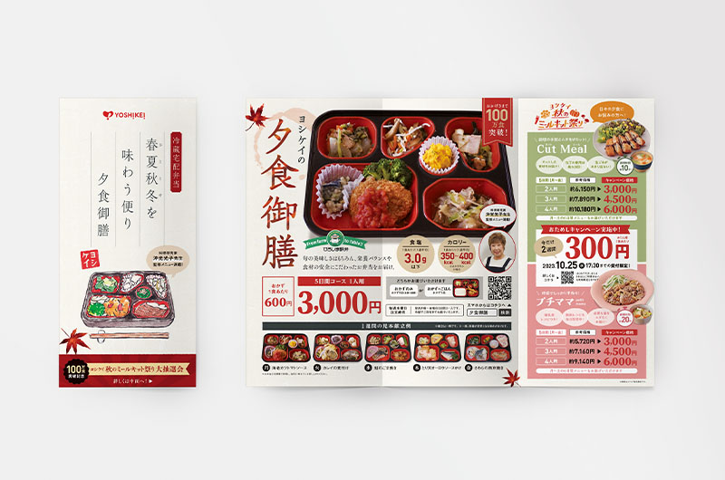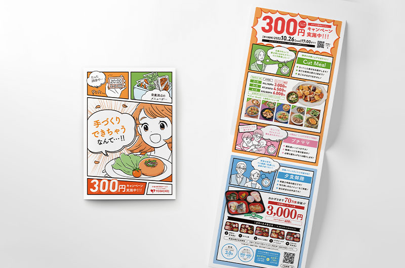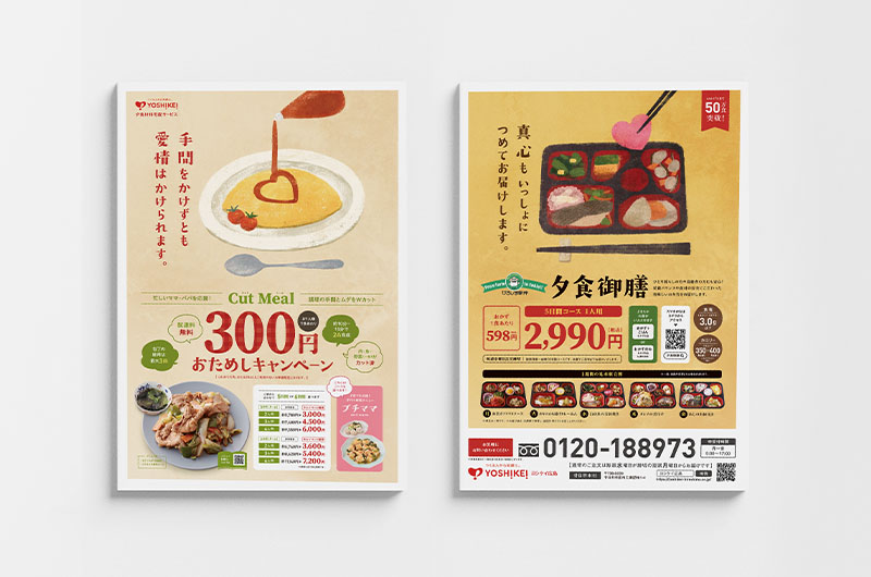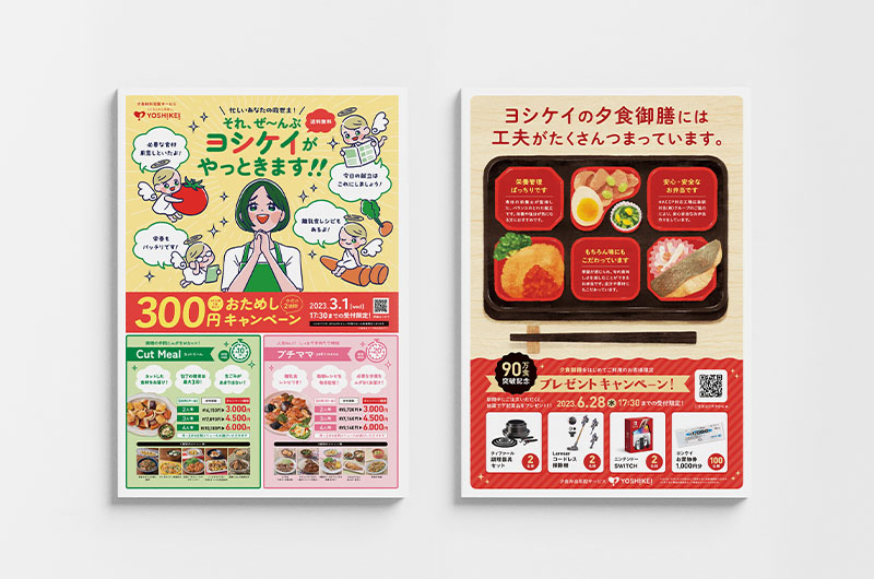 ヨシケイ広島様のコンセプトを分かりやすく表現するため、イラストやコピー、折り方などでインパクトがあり、目を引くような工夫をこらしたチラシをデザイン。商品メニューそれぞれのターゲットとなる顧客層に訴求するよう、意識してデザインしている。