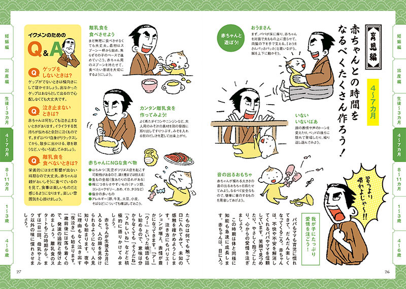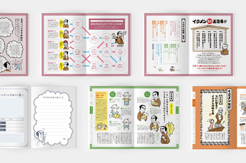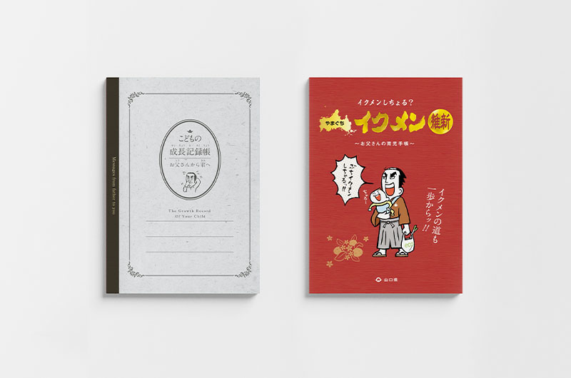 山口県らしさを表現するために『イクメン維新』をテーマに設定し、子育て世代に興味を持ってもらうことを目的とした父子手帳。表4側から開くと成長記録帳として使える。ユーモアあふれるインパクトのあるイラストで、父親の役割や妻へのサポート方法をわかりやすく記載し、県内外のマスコミなどから大きな反響があった。