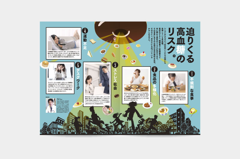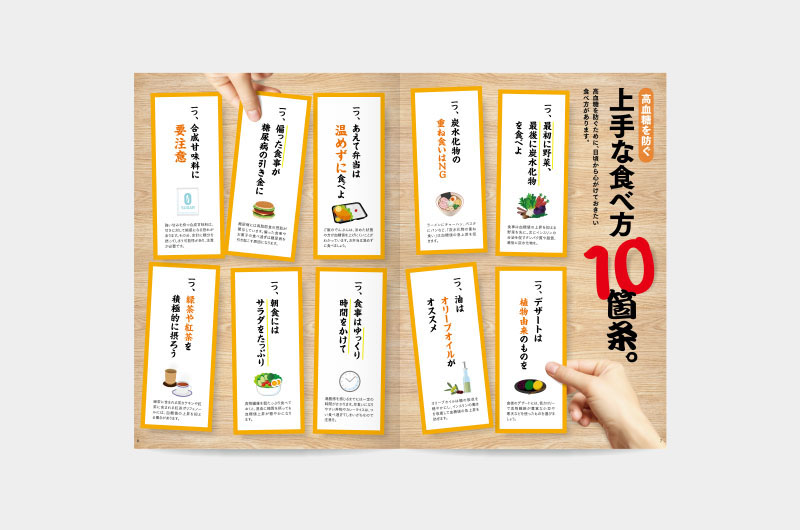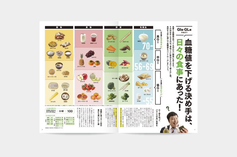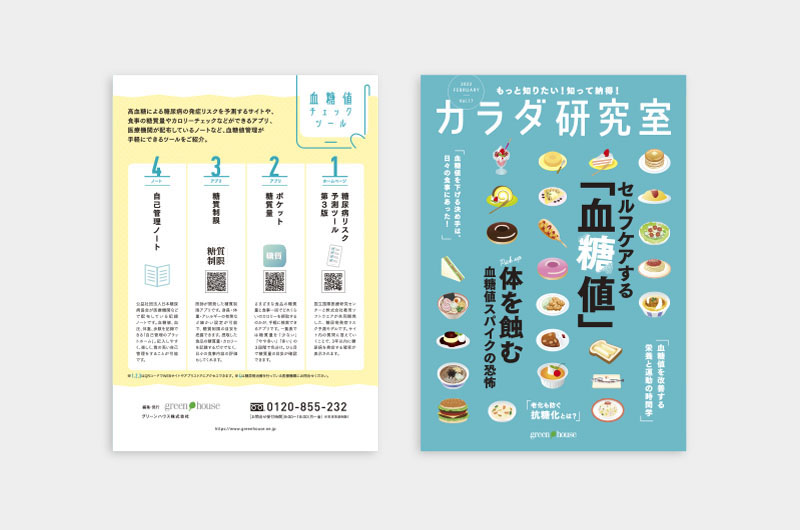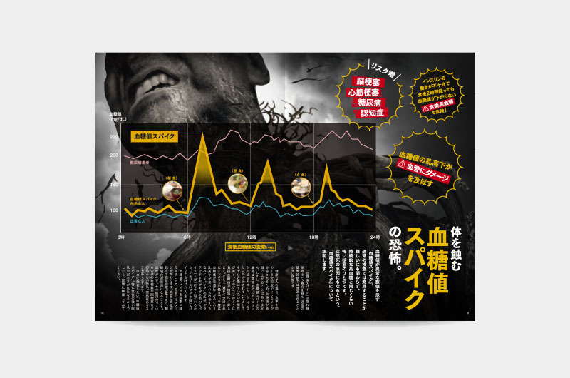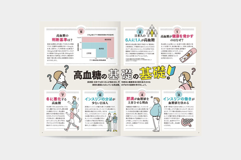 健康について1つのテーマを深掘りする「カラダ研究室」。読者に興味を持っていただけるようにデザインはフォーマット化せず、毎号、見開きごとにデザインを変更してインパクトある誌面に。